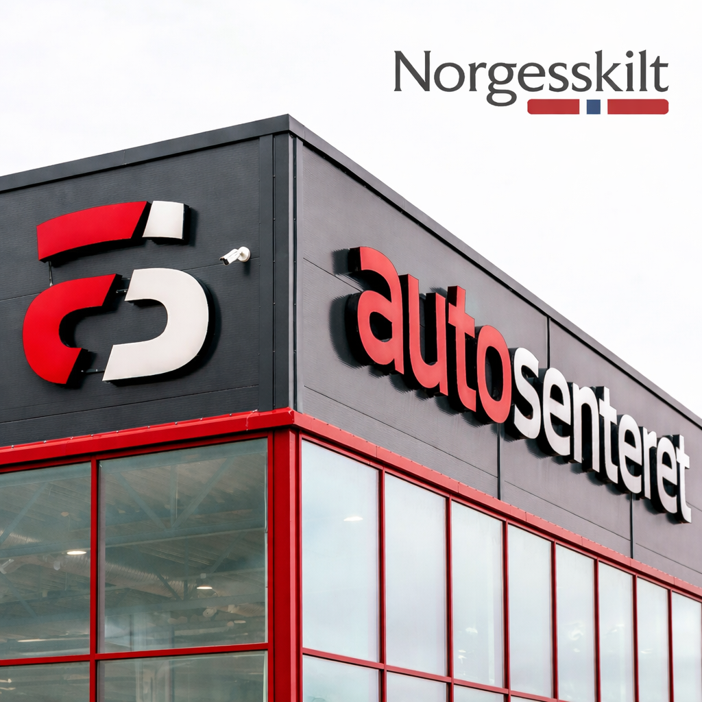 12 stk. skilt, 1500 × 360 mm, med utskåret front, transolvent folie og LED-belysning. Lakkert i fasadeplatens RAL-farge.